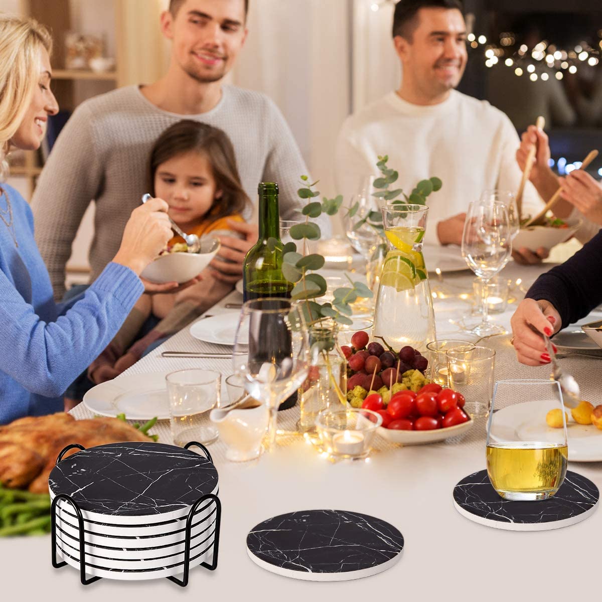 CeramicCoaster üst tabakası, masanızı kuru tutmak için normal Silikon bardak altlığından daha iyi emen emici seramiktir. - Premium Tutucu Dahil Siyah demirden yapılmıştır ve bardak altlıklarınızı saklayacak ve yerden tasarruf sağlayacaktır. O bardak altlığı yığınını sürekli toplamak için zaman kazanın. Kullanılmadığı zaman bardak altlıklarınızı bu şık bardak altlığı tutucusuna düzgünce yerleştirin. - Uygun Boyut ve Easy CleanCoaster çapı 4 inç, tüm bardaklar, kupalar, bardaklar için uygundur.