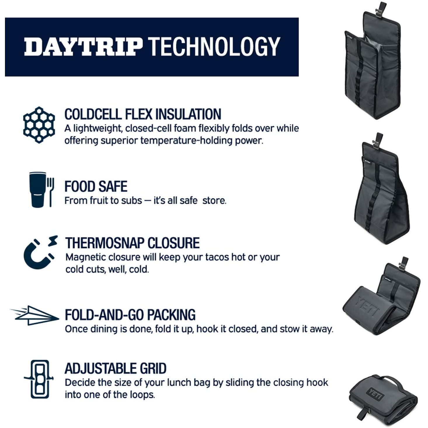 Daytrip Lunch Bag, menüden ıslak sandviçleri ve ılık içecekleri çıkarır, böylece gerçekten dört gözle bekleyeceğiniz bir yemek hazırlayabilirsiniz. Ve evet, meyveden sübyelere kadar Gıda Güvenli - saklaması güvenli. - COLDCELL FLEX YALITIM: Hafif, kapalı hücreli köpük, üstün sıcaklık tutma gücü sunarken esnek bir şekilde katlanır. - THERMOSNAP KAPATMA: Manyetik kapatma, tacolarınızı sıcak veya soğuk etlerinizi soğuk tutar. - KATLA VE GİT AMBALAJ: Yemek bittiğinde katlayın, kancayı kapatın ve saklayın. - AYARLANABİLİR IZGARA: Kapatma kancasını halkalardan birine kaydırarak öğle yemeği çantanızın boyutuna karar verin. Günlük Gezi Öğle Yemeği Çantası 8,75 L x 5,75 G x 8,75 Y ölçülerindedir.