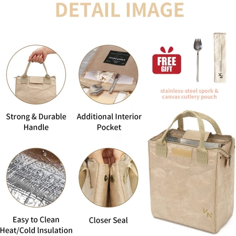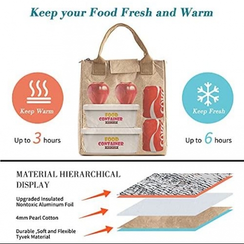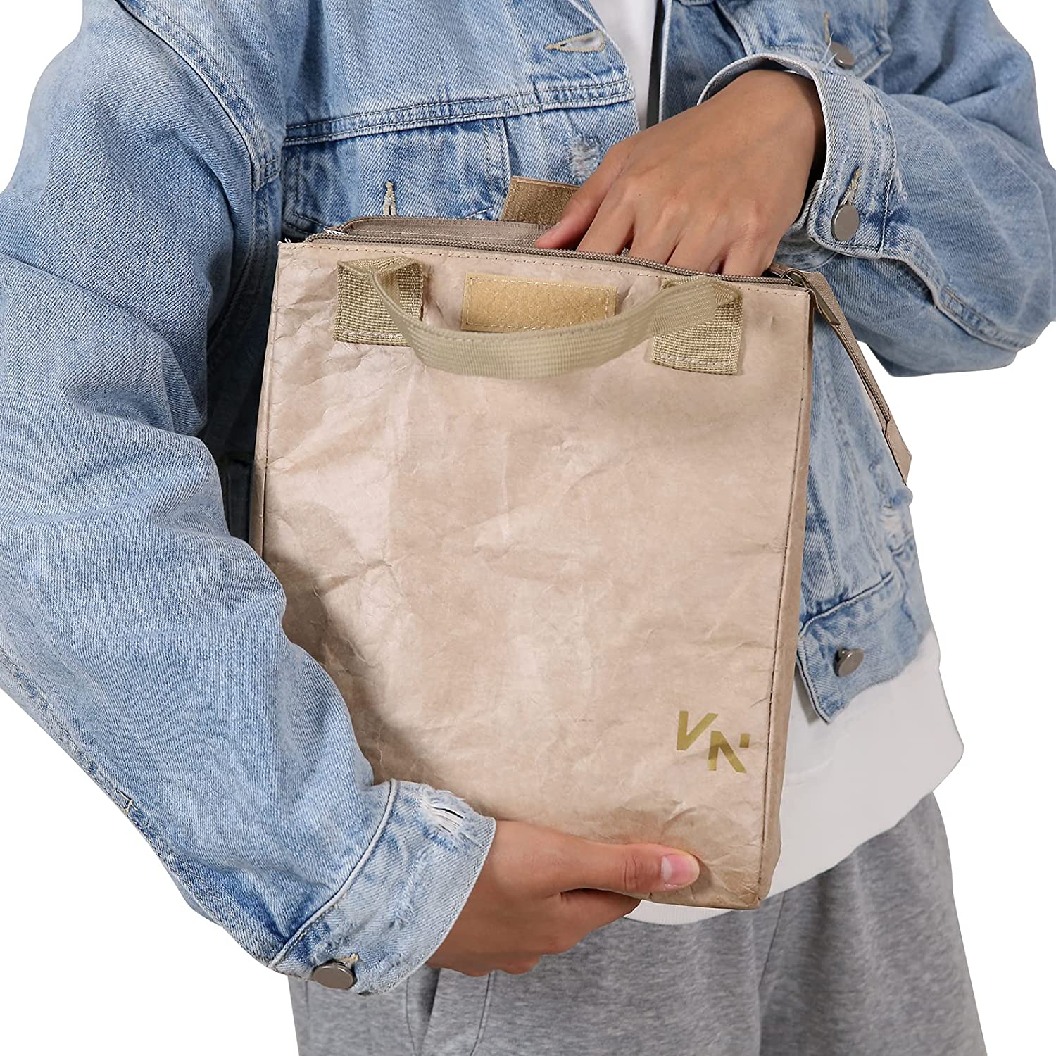 Güçlü, Dayanıklı ve Yeniden Kullanılabilir Kağıt Gibi Malzeme VonNova Öğle Yemeği Çantalarının kökeni, Kahverengi Kağıt Öğle Yemeği Çantalarından geldi. Kağıt faktörünü andıran dayanıklı Tyvek malzemeden yapılmıştır ((KAĞIT DEĞİLDİR!); Tyvek suya, aşınmaya, bakteri girişine ve yaşlanmaya karşı dayanıklıdır.Kadınlar ve erkekler için VonNova Öğle Yemeği Çantaları pratik, yenilikçi ve yeniden kullanılabilir. Her VonNova Öğle Yemeği Çantası Tek kullanımlık plastik poşet ve kağıt poşetlerin yerini alarak çevreye yardımcı olur. - Geniş Kapasiteli & Yalıtımlı İç Mekan Yalıtımlı termal astar ile üretilen VonNova yalıtımlı öğle yemeği çantası, yiyeceklerinizi saatlerce taze tutar.Yemekleriniz 6 saate kadar soğuk ve sıcak tutulur. 3 saate kadar. İç mekan, çeşitli kap boyutlarını, içecekleri, meyveleri ve atıştırmalıkları saklamak için 9,8" x 6,1" x 11" (U*G*Y) ölçülerinde daha yüksek bir kapasite için tasarlanmıştır. Ek iç cep ile, aynı zamanda Anahtarları, telefonları, kartları vb. saklamak için uygun- Kolay Bakım Nemli bir bezle silin ve kurumaya bırakın. Çamaşır suyu kullanmayın. Çamaşır makinenizde veya kurutma makinenizde kullanmayınız. Kuru temizleme yapmayın veya ütü kullanmayın. Tyvek, kağıda benzeyen benzersiz hafif dokusuz bir malzemedir. Kırışıklıklar, kırışıklıklar normaldir ve VonNova Lunch Box'a şık ve otantik bir görünüm sağlar.