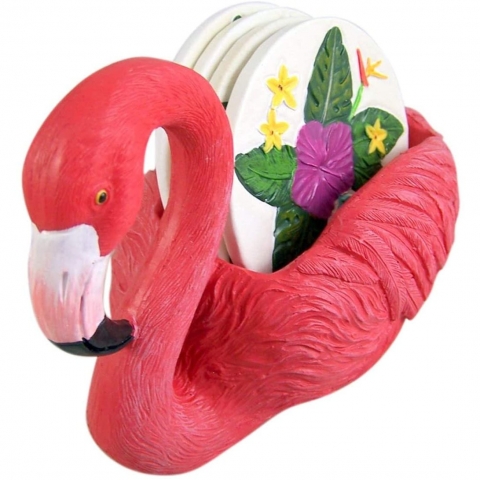 Heykelcik Boyutu: 6 1/2 İnç (U) x 3 1/4 İnç (G) x 4 1/2 İnç (Y) - Heykelcik Reçinedir - Tropikal Çiçek Betimlemeli 4 Bardak içerir, 3 1/4 İnç Çapı - Güzel Flamingo İçecek Altlığı Seti Her Masaya Tropikal Bir His Verecek
