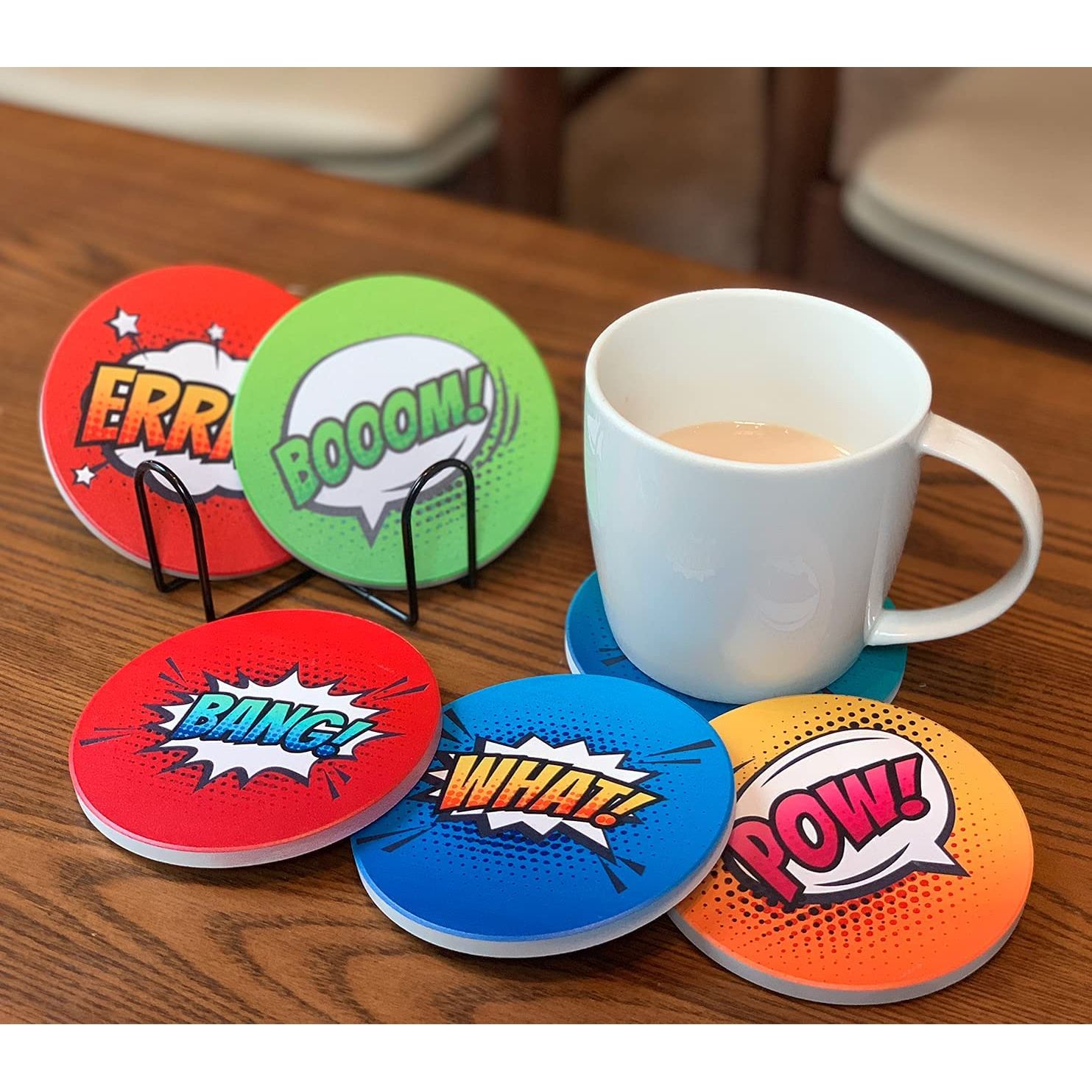 BENZERSİZ TASARIM: Bu yuvarlak içecek altlıkları, Masanızı daha canlı ve ilginç hale getiren 6 renkli sevimli ve çizgi film kelimesiyle basılmıştır! Tasarımlarımız, uzun süreli bir etki için doğrudan bardak altlıklarına basılmıştır. - Süper emilim Altlığımızın üst tabakası yüksek emici seramikten yapılmıştır, sıcak ve soğuk içecekler için uygundur. Bardak üzerindeki su damlacıkları görünür bir hızda emilecektir. Altlık, masanızı veya mobilyanızı kuru tutabilir.