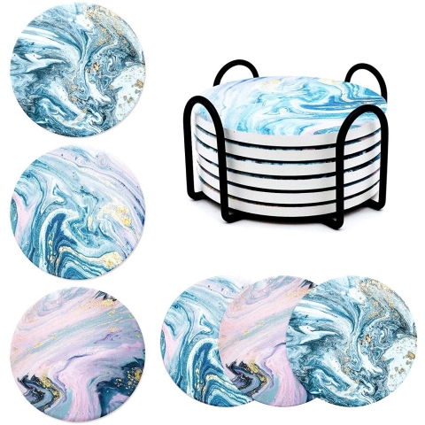 Eşsiz Tasarım: Bu emici sanat altlığı seti, üç renkli mermer altın okyanusta 6 yuvarlak seramik taş altlığı içeriyordu. Güzel girdap sıvı akışlı guaj süslemek altın tozları da dekorasyon için kullanılabilir. - Güçlü Emici: Altlık üst tabakası emici seramiktir, kahve lekelerini ve suyu 5-10 saniye içinde hızla emebilir. Suyu emdikten sonra lekelenmeden. Masanızı kuru ve temiz tutacaktır. - Komple Set: 6 adet siyah demir bardak altlığı tutucusu olan bir set altlığı