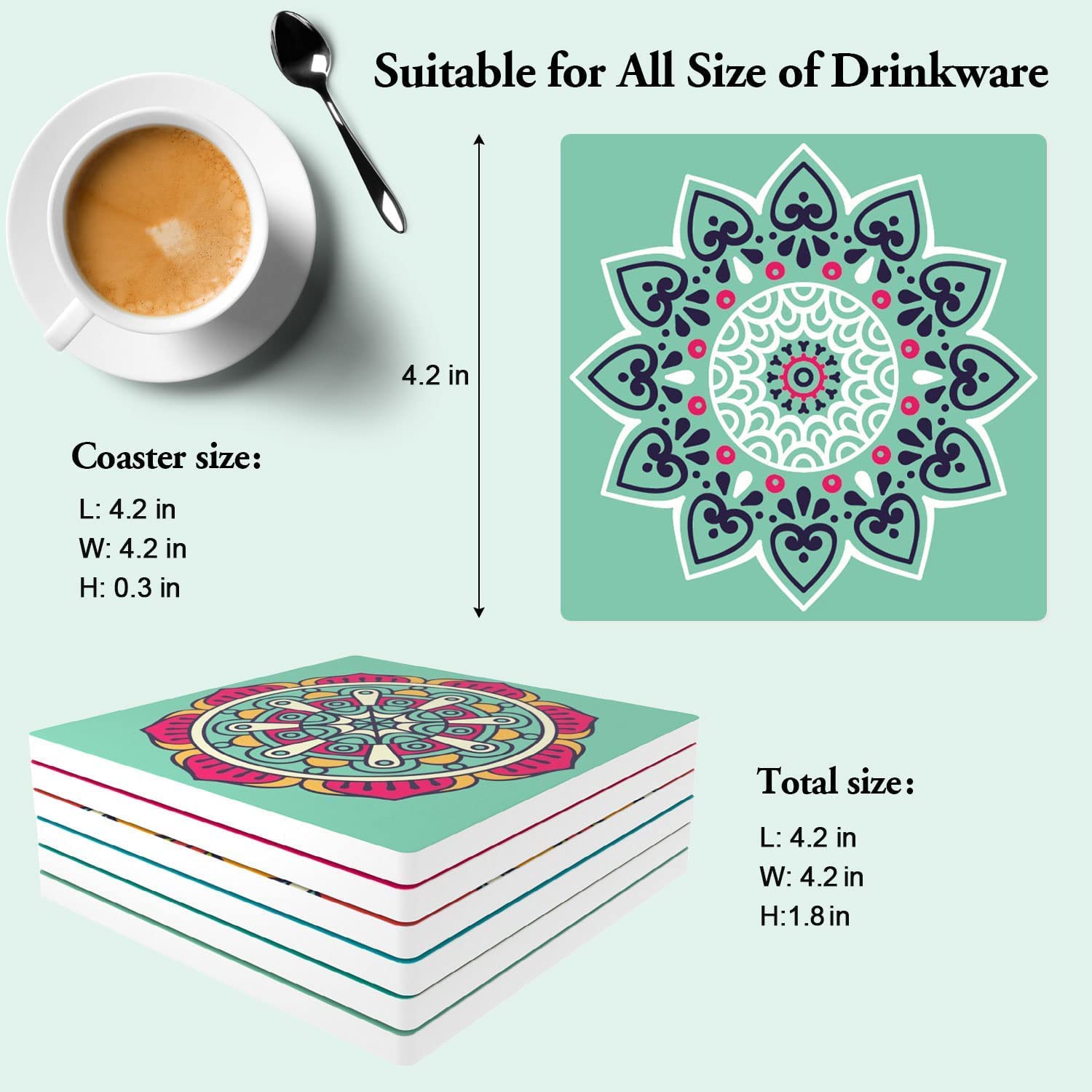 Eşsiz Bohem Desen: Paket, 6 parça seramik bardak altlığı ve yerden tasarruf sağlamak için depolama için kullanılan dayanıklı bir metal tutucu içerir. Mutfak veya yemek masası için dekoratif parçalar ve ev, düğün, parti ve ziyafet için mükemmel bir görüntü. - Yüksek Nem Emici: Bardak altlığının üst tabakası, hızlı bir şekilde damlayan su damlalarını emecek ve altlığın ve masanın yüzeyinde, masanızı temiz ve kuru koruyabilecek hiçbir filigran izi bırakmayan emici seramiktir. -