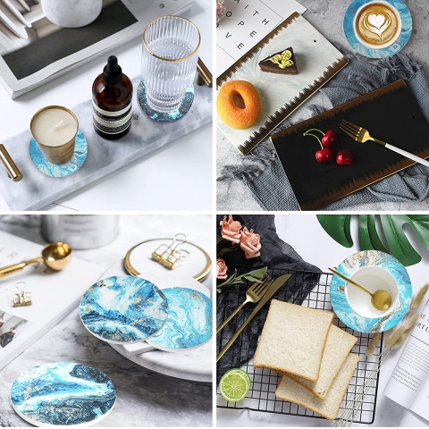 Güçlü Su  - Bu bardak altlığı seti, kumtaşı, deri, keçe ve silikon bardak altlıklarından daha iyi olan seramik taştan yapılmıştır. Suyu emebilir veya lekeleri daha hızlı içebilir ve masaüstünü temiz tutabilir. - Mantar Taban - İçecek Altlıkları'nın arkası, en sevdiğiniz ahşap masanın aşınmasını ve çizilmesini önleyen bir mantardır. Ayrıca masaya güçlü bir tutuş sağlayabilir, masaya sıkıca yapışabilir ve düşmeyi önleyebilir. - Temizlemesi Kolay - Normal şartlar altında Ceram'ı kolayca silebilirsiniz.
