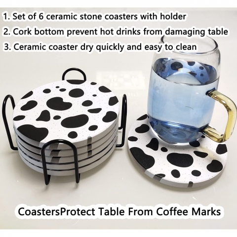 Boyut:10.2x10.2x0.5cm Malzeme: seramik taş yüzey ve mantar alt - Tutucu setli bardak altlığı: Altlık setleri, altlığı düzenlemenizi sağlayan 6 yuvarlak seramik altlık ve siyah bir altlık tutucu içerir. - Çabuk Kurur: Seramik altlığın üst kısmı su emicidir, Masayı kahve ve su izlerinden koruyabilir. Seramik yüzeyin temizlenmesi kolaydır ve çabuk kurur. - Mantar Taban: Alt kısım mantardan yapılmıştır, masalarınızı çizmez ve kaymayı önleyen kaymaz bir yüzey sağlar.