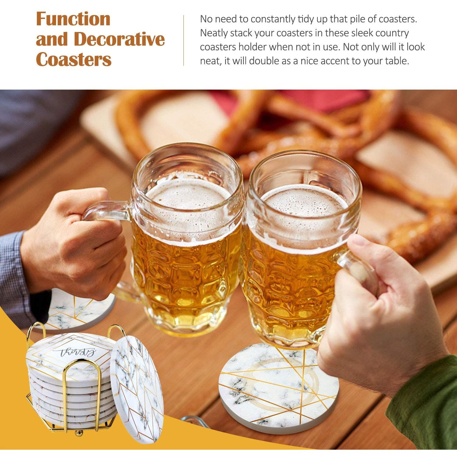 FARKLI MODERN TASARIMLAR Yüzeyinde 8 farklı mermer deseni bulunan bardak altlığı takımı, mutfakta, yatak odasında, ofiste sehpanıza veya ev dekorunuza şıklık katacak. İçecek altlıkları ayrıca tatil partisi, oturma odası dekoru, Noel, sevgililer günü veya erkeklere, kadınlara düğün kayıt hediyeleri arasında tercih edilen seçim olacaktır - LÜKS ALTIN TUTUCU İLE Bu içecek altlıkları narin altın tel caddy ile yapılır. Her bir bardak altlığı, 0,3 inç kalınlığında 3,7 X 4,3 inç ölçülerindedir. ve o wi