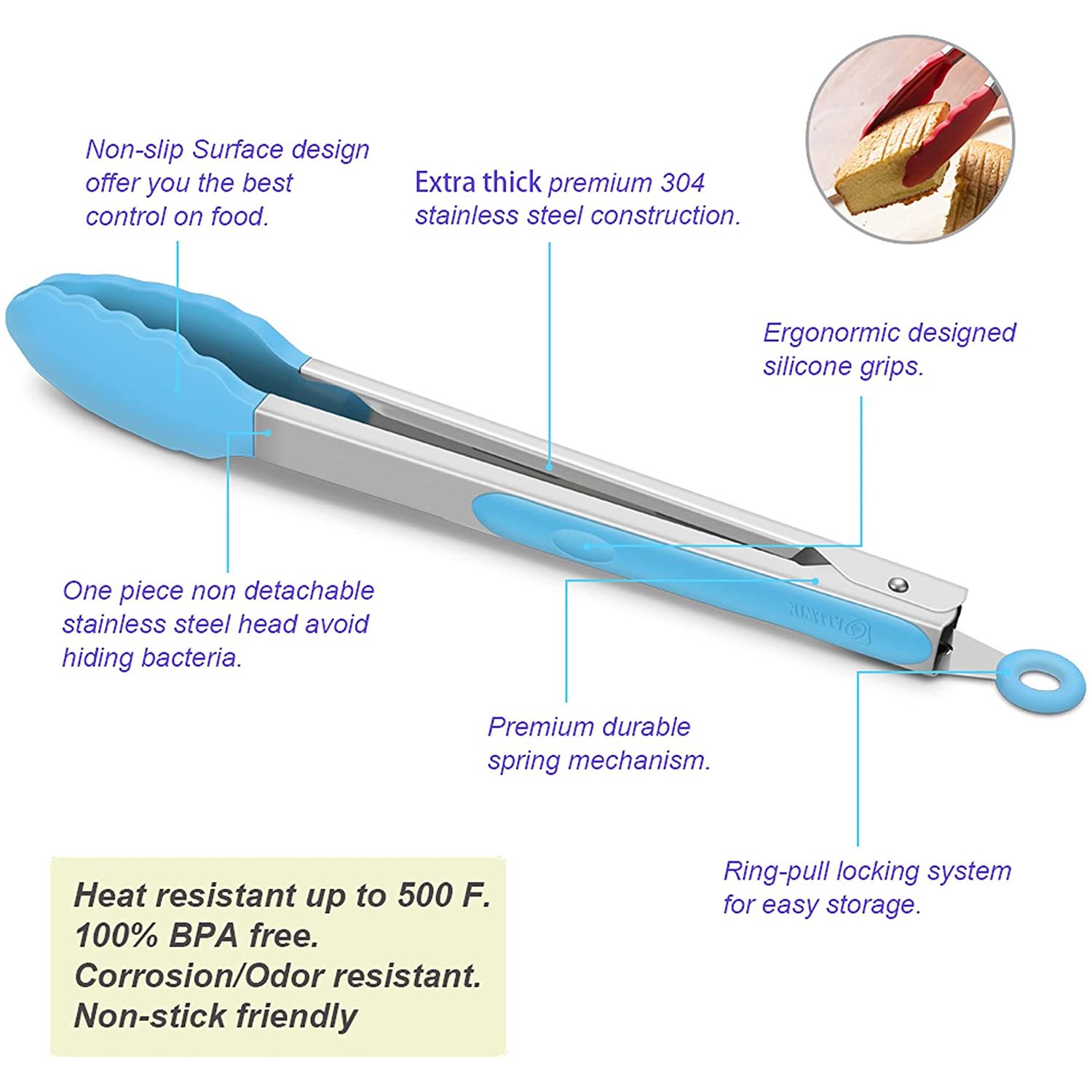 500 derece F'ye kadar ısıya dayanıklı. - Yapışmaz, Korozyona dayanıklı ve Kokuya dayanıklı. - Hijyenik silikon maşa BPA içermez. - Kilitleme klipsli birinci sınıf 304 paslanmaz çelik yapı. - Kaymaz Yüzey tasarımı size yiyecekler üzerinde en iyi kontrolü sunar.