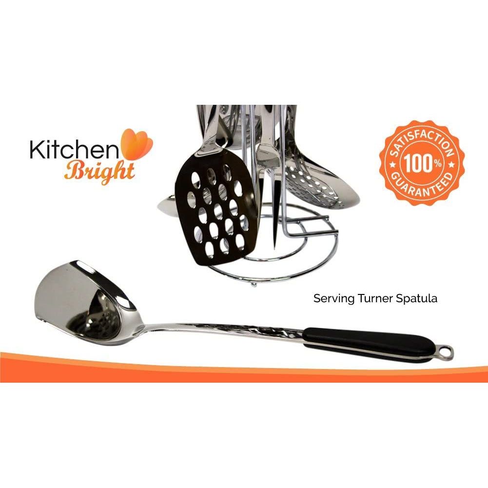 CHEF KALİTE Günlük kullanım için pratik aletler. Servis kaşığı, oluklu çevirme spatulası, servis çevirme spatulası, skimmer, çorba kepçesi, oyma servis çatalı, kap tutucu. İster bir şef, ister kendileri veya sevdikleri için yemek hazırlayan biri olsun, herkesi memnun etmek için bu harika mutfak gereçleri setinde her şey var - bu profesyonel kalitede mutfak aletleri seti faturaya uyacak! - ÖMÜR BOYU KULLANIM EN İYİ paslanmaz çelik (korozyona karşı en dayanıklı) -- paslanmaz çelik en iyisidir.