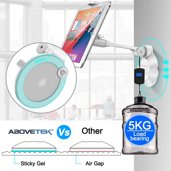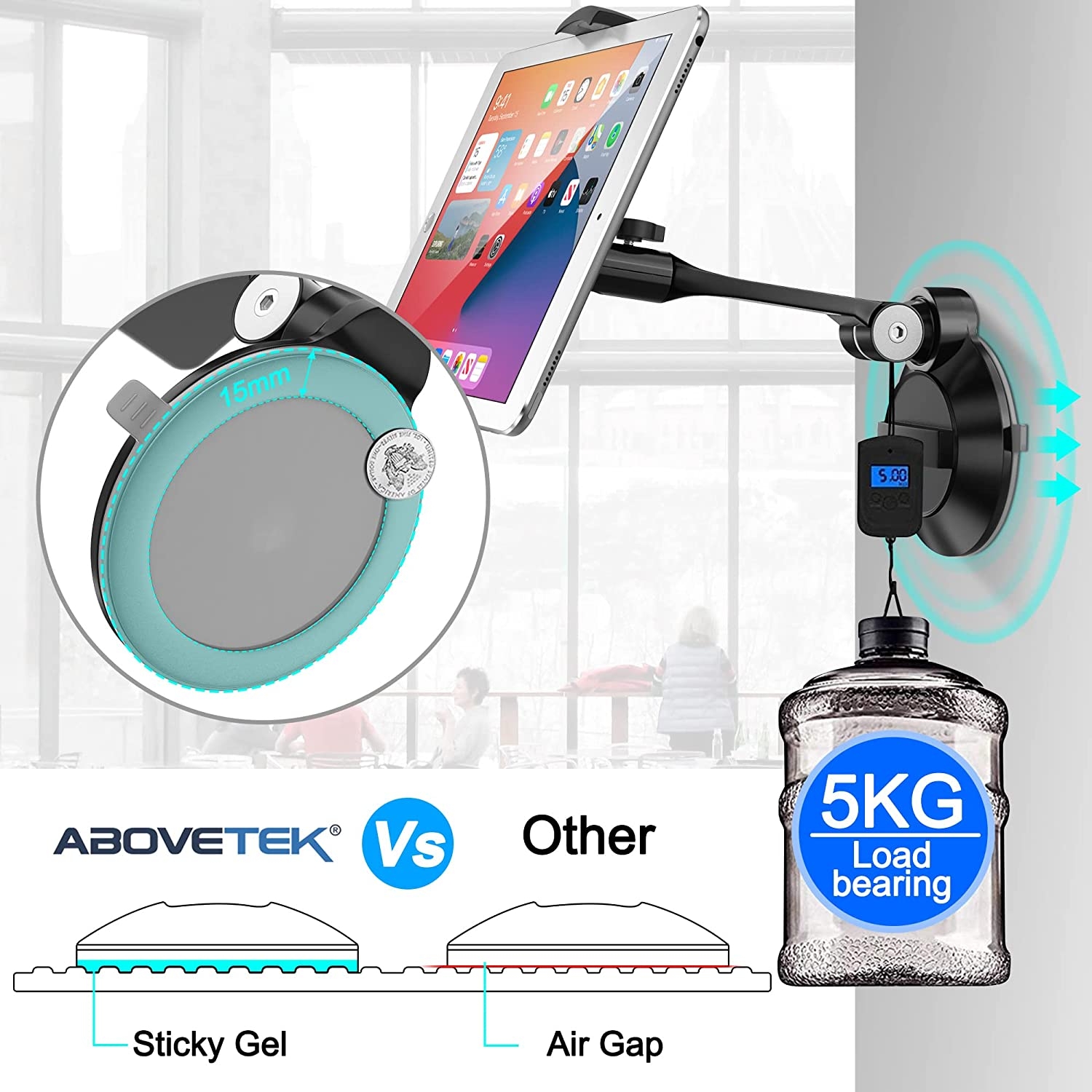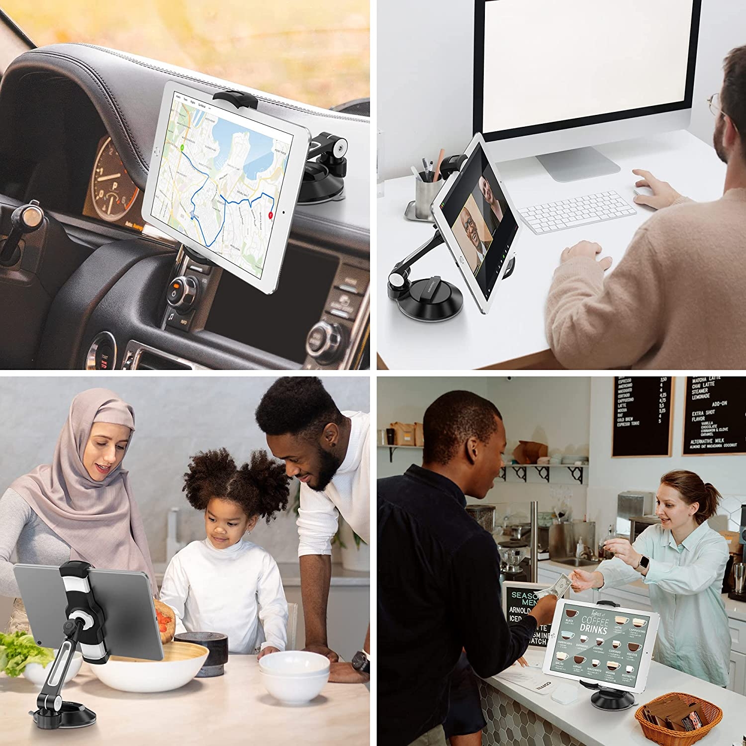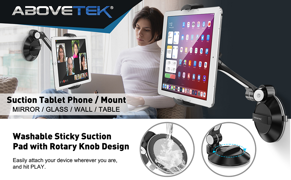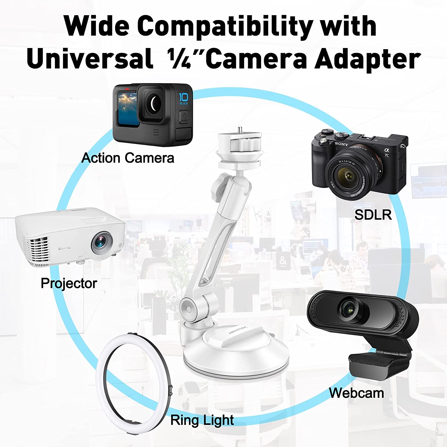 Sağlam kol artı emiş tabanı, en iyi duruş ve göz seviyesinde görüntüleme için herhangi bir dikey veya yatay pürüzsüz yüzeye güçlü bir şekilde yapışır.