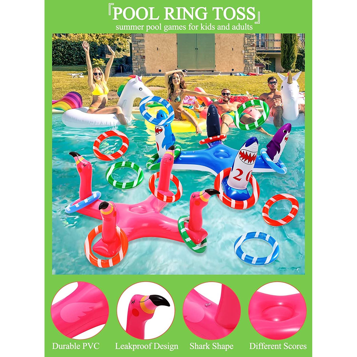 ABD Patentli Flamingo Halka Atma Oyunları: Pakette 1 x şişme flamingo halka atma oyunu, 6 x fırlatma halkası (2 kırmızı halka, 2 mavi halka ve 2 yeşil halka) ve 1 x pompa bulunur. Çok oyunculu için 8 adet şişme havuz oyunları. - Yaz Bilardo Oyunları: Bu şişme havuz oyunu hafif ve taşınabilirdir, açık ve kapalı partiler için mükemmeldir. Havuzda, kumsalda, denizde, gölde ve çimende bilardo oyunlarını oynayabilir, yazın keyfini doyasıya çıkaralım. - Çocuklar ve Yetişkinler için Havuz Oyunları: Şişirilebilir flamingo halkasının boyutu