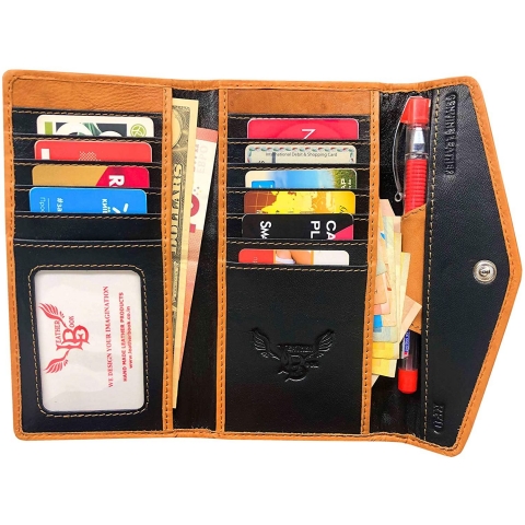 Leather Book RFID LW-1801 (Jersey-CAT) Bayan deri Clutch Slim cüzdan. - 10 Kart Yuvası, 2 kimlik penceresi, Üç sürgülü cep, İnek forması ve Kara koyun Napa Gerçek Deri. - Dahili RFID engelleme (radyo frekansı tanımlama), sizi elektronik seçim cebinden yalıtmak için tasarlanmıştır. - Madeni paralar ve anahtarlar için arka tarafta metal fermuarlı cep. 2 ayarlanabilir çıtçıt Düğme ile kapanır, İç kısımda siyah dimi kumaş Astar kullanılır. - Çekici Vantage görünüm, Gerçek deri, Parti spor cüzdanı, Süslü Tasarım,