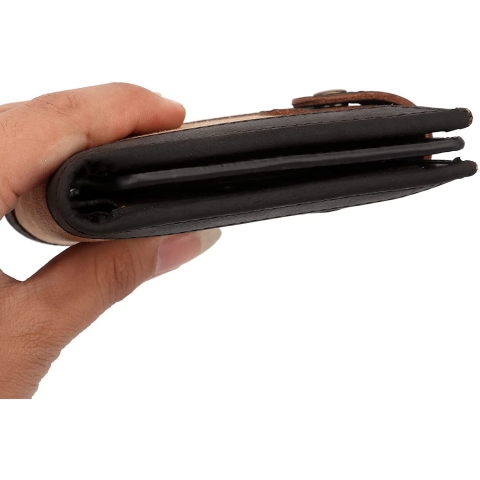 Yüksek kaliteli kanvas ve deriden yapılmış TOURBON cüzdan - Kartlar için 8 bölme, faturalar için 1 yuva, madeni paralar için 1 bölme - Çıtçıtlı kapatma - Hem ön hem de arka cepte taşıma için uygundur - Kart güvenlidir ancak içeri ve dışarı kaydırılması kolaydır