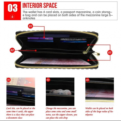 Malzeme: Yüksek kaliteli metal fermuarlı PU Deri kumaş, korteks hatları temiz, su geçirmez ve dayanıklı, iyi bir his ve görünüm. -  kadın cüzdanları büyük kapasiteli, 4 kart yuvalı uzun stil cüzdan, pasaport asma kat 1 fermuarlı bozuk para saklama çantası ve asma büyük banknotların her iki tarafına da yerleştirilebilir. - İşlev: Zip-Around Organizatör Cüzdanı, nakit, kart ve madeni para tutmak için daha güvenli, düşmelerini önleyin, nakit ve kartların erişimini kolay tutun. -