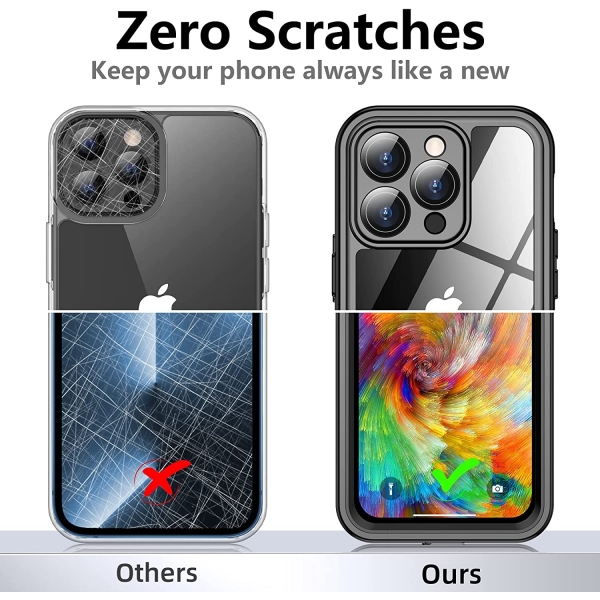Temperli cam iPhone 14 pro için tasarlanmış su geçirmez kılıf, özel olarak dahili cam ekran koruyuculu. 0,33 mm temperli cam %99,99 tepki hassasiyetini korur ve asla çizilmez.