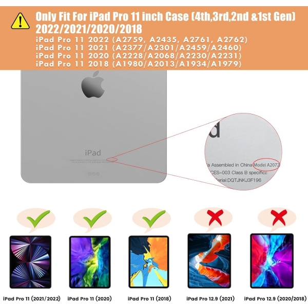 iPad Pro 11 2022 4. Nesil (A2759, A2435, A2761, A2762), iPad Pro 11 İnç 3. Nesil 2021 (A2377/A2301/A2459/A2460), iPad Pro 11 İnç 2. Nesil 2020 (A2228/A2068/) için özel olarak tasarlandı A2230/A2231) ve iPad Pro 11 İnç 1. Nesil 2018 (A1980/A2013/A1934/A1979) ile uyumludur.