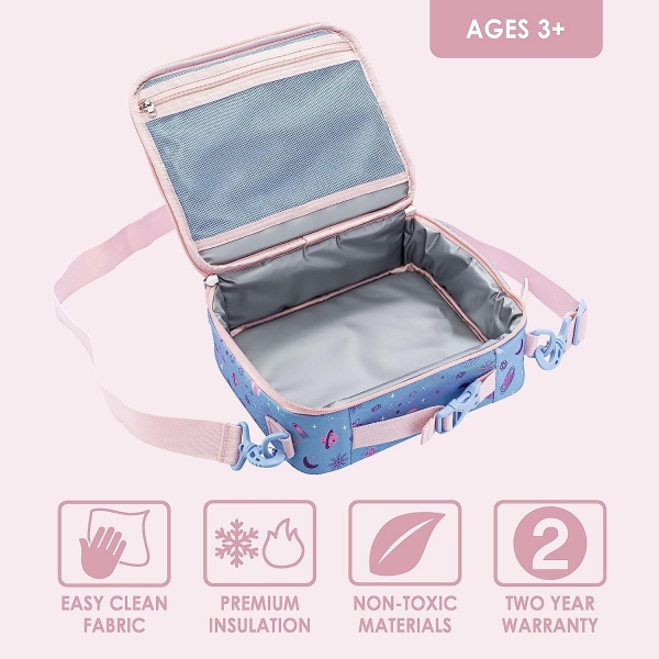 Yastıklı bir tutamak, rahat bir taşıma sağlar veya ayarlanabilir bir kayış, çocuğunuzun omzuna kolayca oturur. Alternatif olarak, öğle yemeği çantası, eller serbest taşıma için bir sırt çantasına bağlanan yerleşik D halkası eklerine sahiptir.