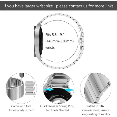 Saat kordonlarını yeniden boyutlandırabilir, ekstra bağlantıyı çıkarabilir ve pakete dahil olan araçla bilek boyutunuza kolayca ayarlayabilirsiniz.