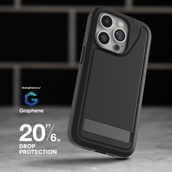 Grafen malzemeden üretilen iPhone 15 Pro Max için ZAGG Everest Snap Kılıfı, 6 m'ye (20 fit) kadar düşme direncine sahip, son derece koruyucu bir telefon kılıfıdır.