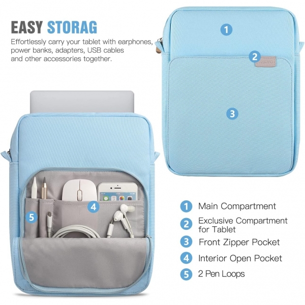 Tabletinizi saklamak için 1 x ana bölme, 1 x ön bölme, 1 x yan bölme, 2 x açık ağ cep ve 1 x fermuarlı ağ cep, kablolar gibi aksesuarlarınız için yeterli alan sunar , fare, kulaklık, notlar, cüzdan, kartlar ve daha birçok küçük eşya sığar.