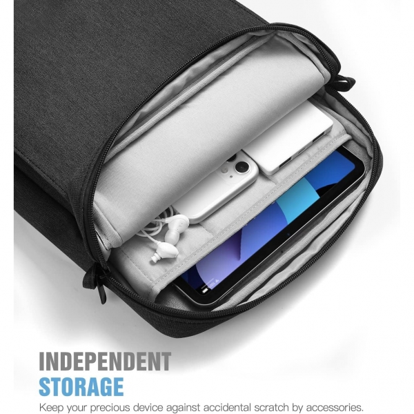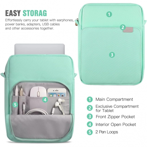 Tabletinizi saklamak için 1 x ana bölme, 1 x ön bölme, 1 x yan bölme, 2 x açık ağ cep ve 1 x fermuarlı ağ cep, kablolar gibi aksesuarlarınız için yeterli alan sunar , fare, kulaklık, notlar, cüzdan, kartlar ve daha birçok küçük eşya sığar.