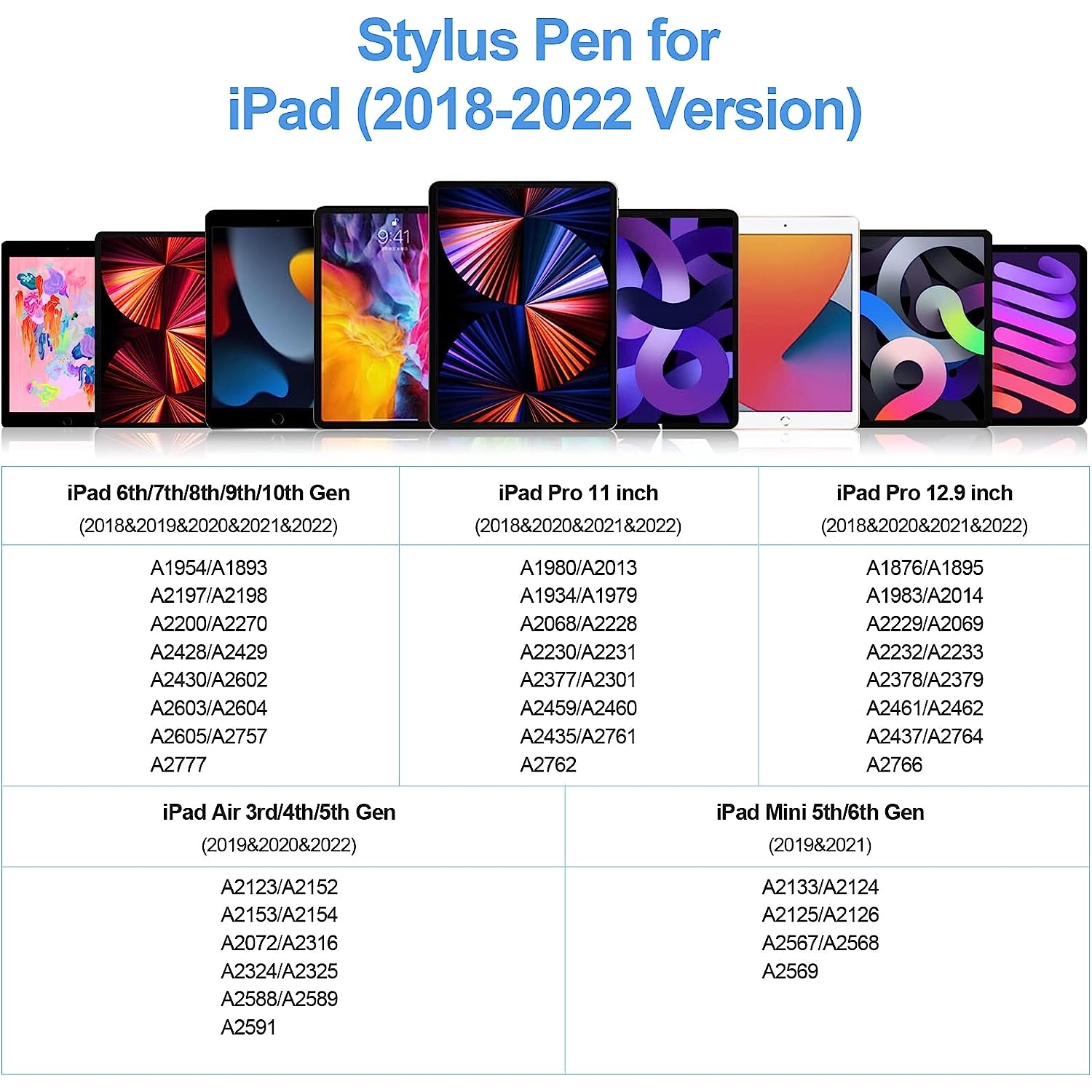 iPad kalemi, iPad 10./9./8./7./6. Nesil, iPad Pro 11" 1./2./3./4. Nesil, iPad 12.9" 3./4./5./6. Nesil, iPad Air 3./4./5. Nesil'i destekler ve iPad Mini 5./6. Nesil