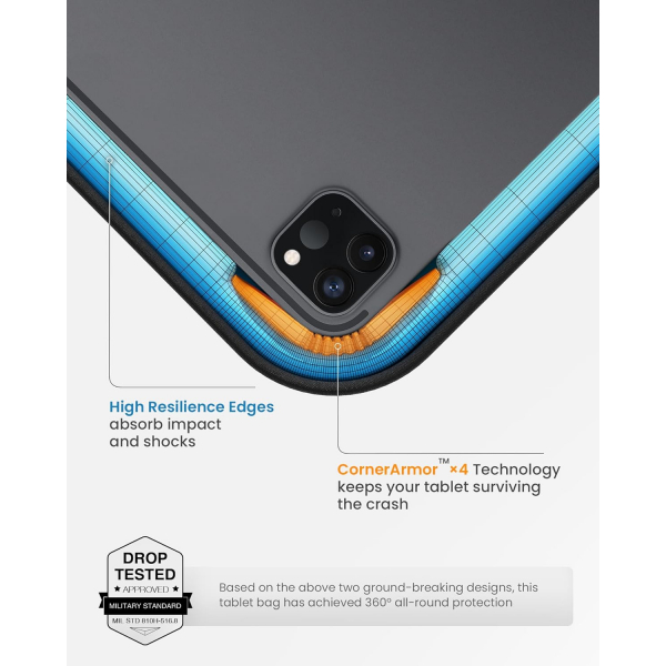 4 CornerArmor koruyucusu, yüksek esnekliğe sahip kenarları ve sofistike, hatlar arası tasarımlı yumuşak kadife astarıyla iPad'iniz, kaçınılmaz darbelere, eziklere, çiziklere ve su dökülmelerine karşı gelişmiş korumaya sahip olur.