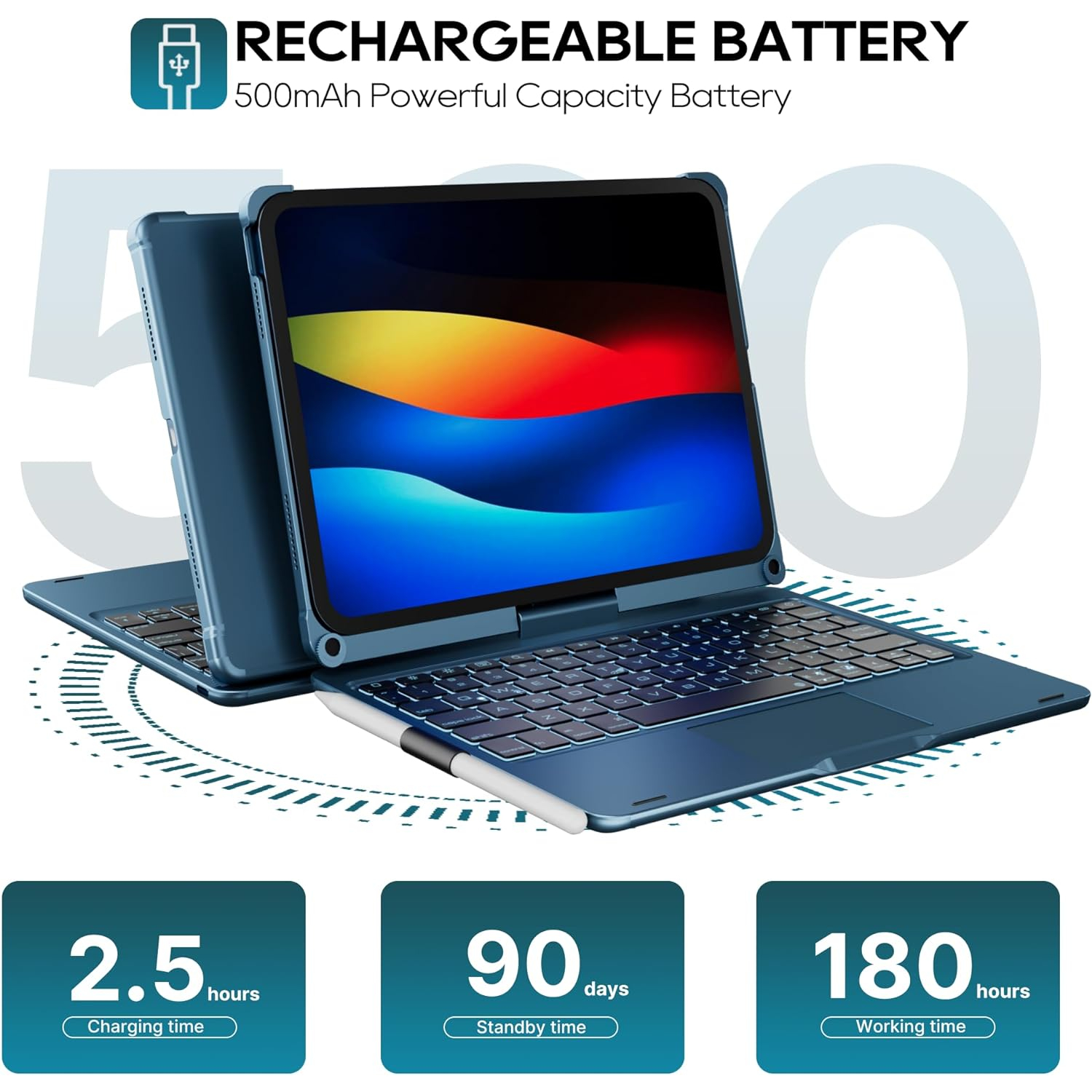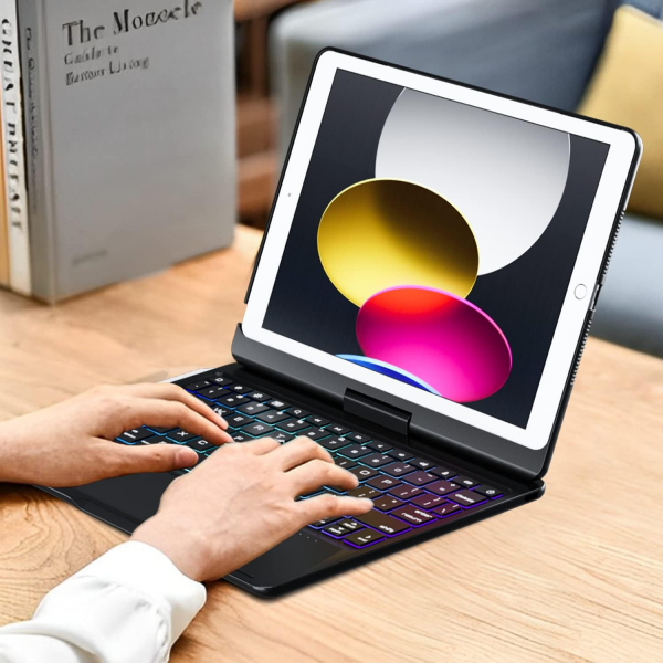 2022 iPad 10. nesil klavye, Otomatik Uyandırma/Uyku özelliğine sahip hafif, sert kabuklu bir stand kapağıdır ve Tip C şarj bağlantı noktası aracılığıyla yalnızca 3 saatlik şarjla birlikte gelir; şarj edilebilir pil, arka ışık kapalıyken 180 saate kadar dayanır .