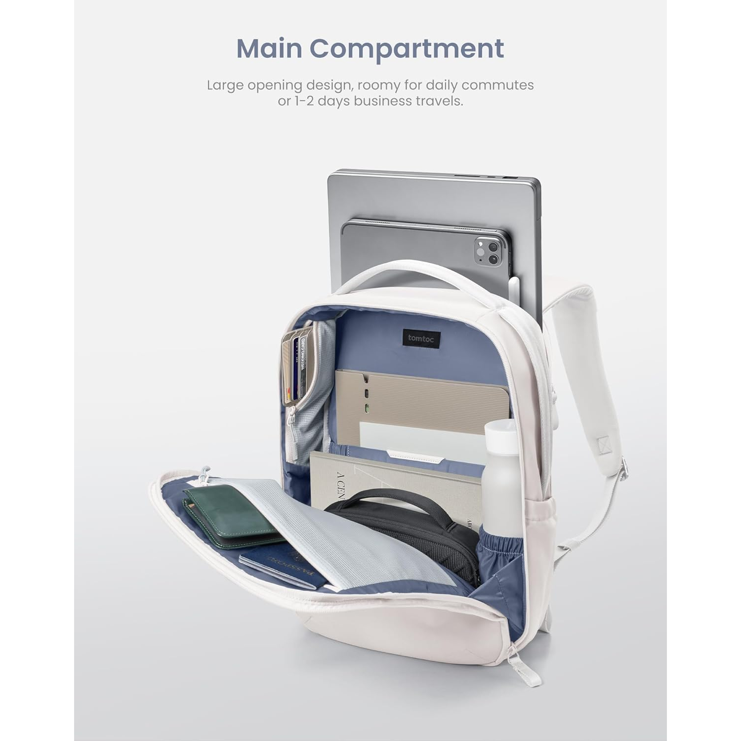 Teknoloji bölmesi, 16 inçe kadar dizüstü bilgisayarlar için gelişmiş bir koruma bölgesini barındırır ve tabletler veya dosyalar için sihirli bir bölge içerir. 1-2 günlük eşyalar için geniş olan ana bölmede görünür ve yan file cepler bulunur.