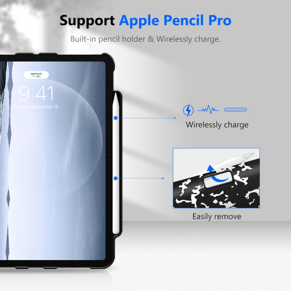 Kılıf açıkken Apple Pencil Pro manyetik ve kablosuz şarj özelliğiyle sorunsuz şekilde çalışır.