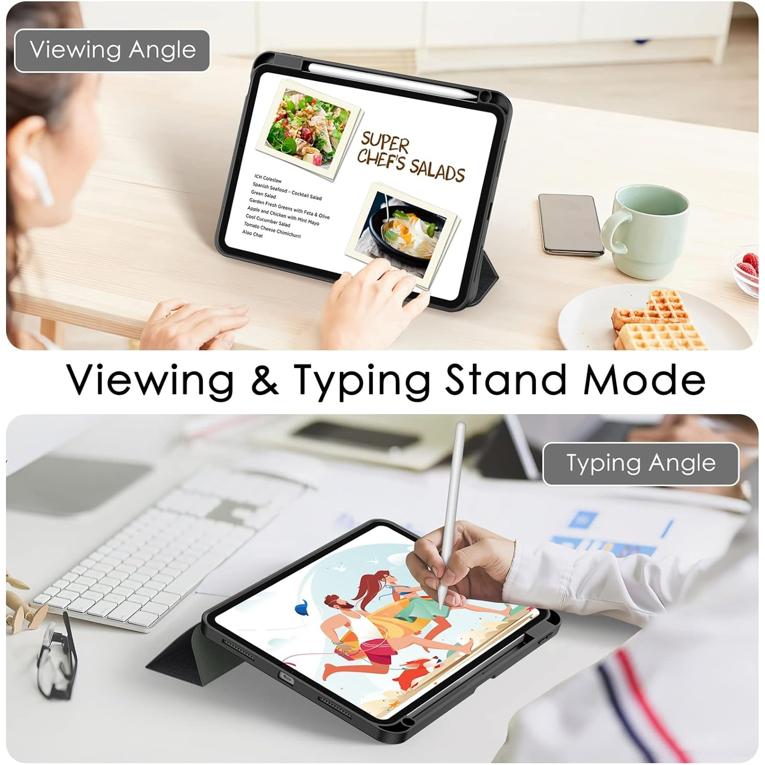 En rahat klavyeyle yazmanın ve film izlemenin keyfini çıkarmak için ipad'i çift ayakta durma konumuyla kolayca destekleyebilirsiniz.