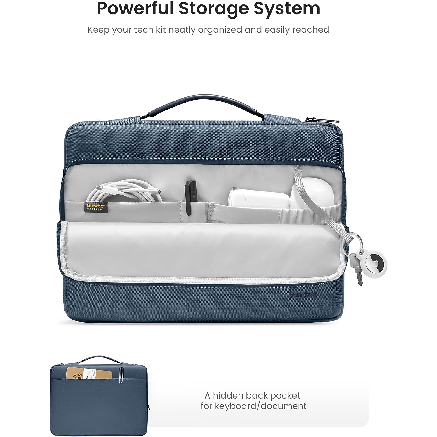 Bu bilgisayar çantasının ön kısmında birkaç küçük cep ve Hava Etiketi veya anahtar için bir kayış bulunan akıllı bir saklama bölmesi bulunur.