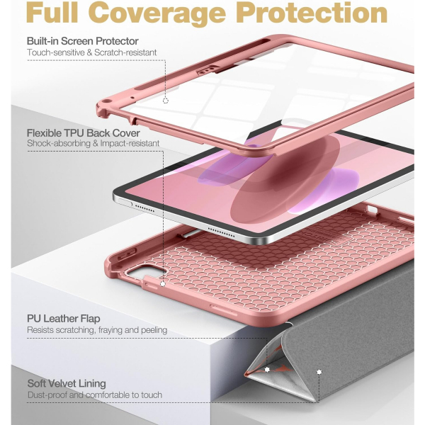 Hoparlör, kamera, ses düğmeleri ve şarj bağlantı noktaları için hassas kesiklere sahiptir, ayrıca bir elma kalem yuvasına sahiptir ve kaleminizi saklamak için rahat bir yer sağlar.
