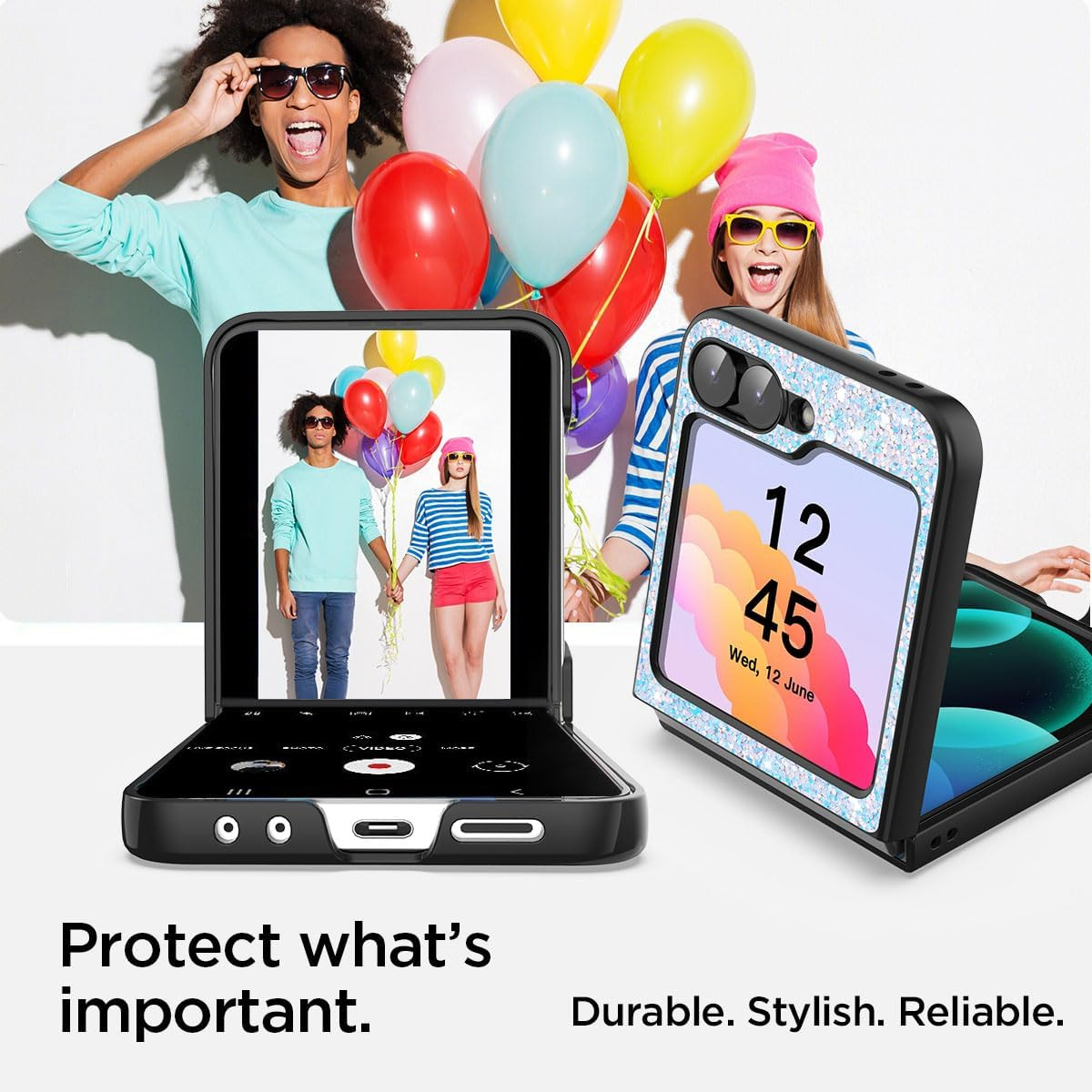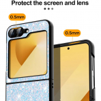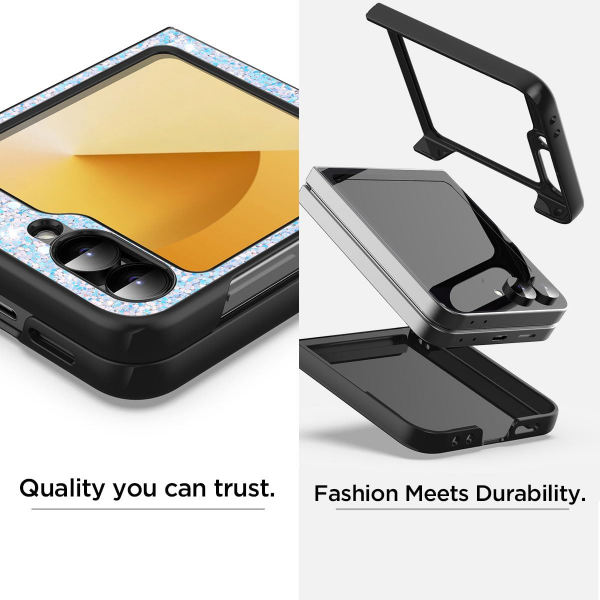 Yükseltilmiş çerçeveli Samsung Flip 6 kılıfı, ekran ve kamera için ekstra koruma sağlar, iç gelişmiş mircodot tasarımı filigranı önler.