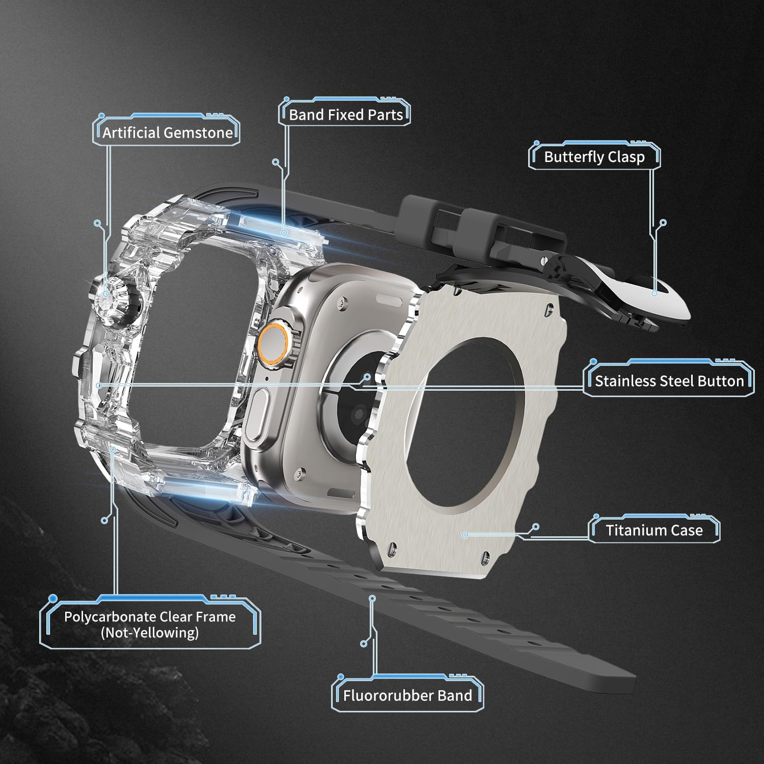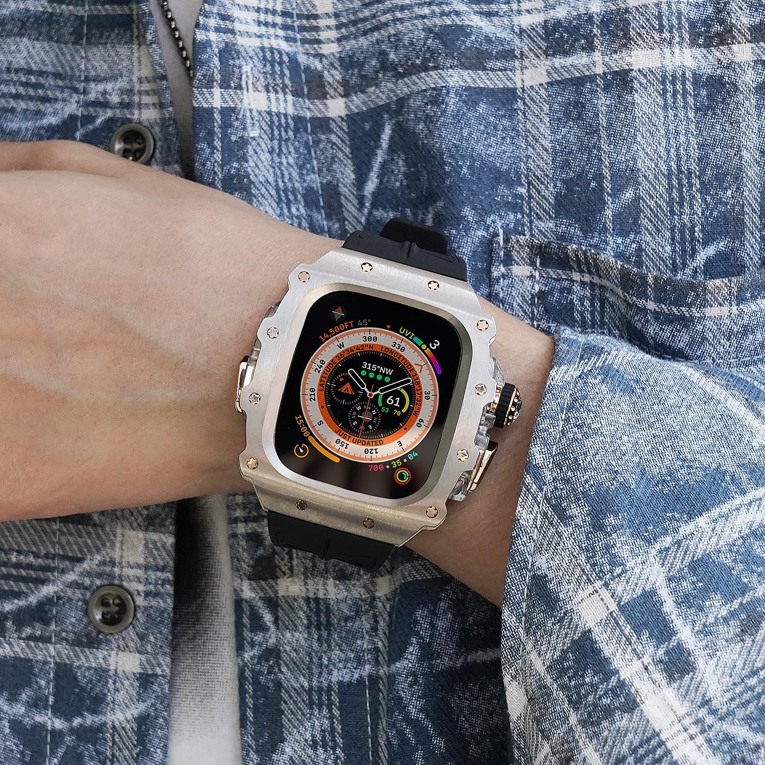 Lüks Apple Watch Ultra 2 / Ultra Kılıf: iWatch 49mm Kılıf, Florin Kauçuk Bant ile Eşleştirilmiş Titanyum + Polikarbonat'tan yapılmıştır, saat kasasının seviyesini artırmıştır.