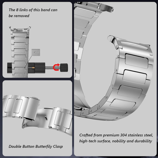 Bant, saate zarafet ve asalet, çok pürüzsüz, dayanıklı ve rahat giyilebilirlik katan ince cila ve çift katmanlı elektrokaplama ile birinci sınıf paslanmaz çelikten yapılmıştır.