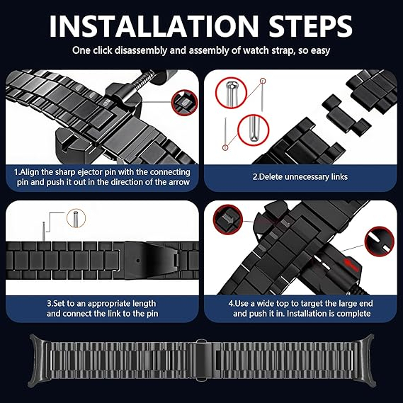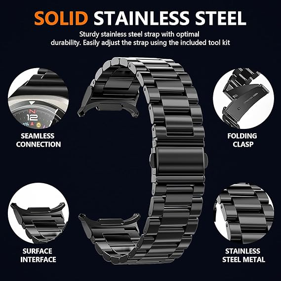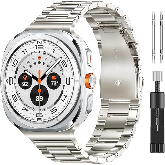 Samsung Galaxy Watch Ultra 47mm için saat kayışı yüksek kaliteli paslanmaz çelikten yapılmıştır ve bilek eğrinize uymasını sağlamak için dikkatlice işlenmiştir.
