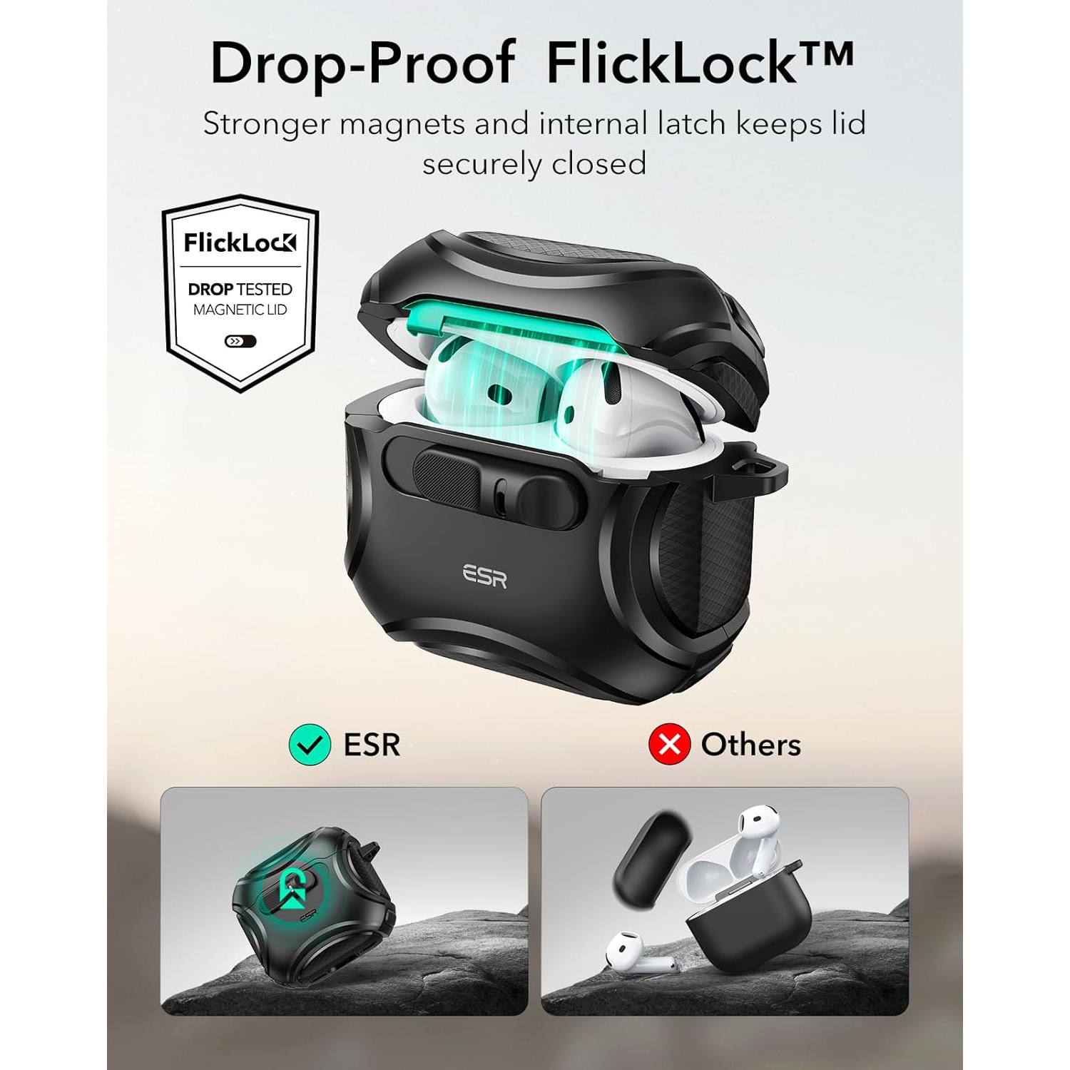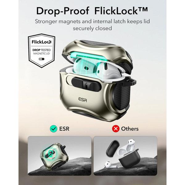 Kapağın üst ve alt kısmında 700 g tutma kuvvetine sahip güçlü mıknatıslar ve dahili bir mandal, AirPods'larınızı güvenli bir şekilde içeride tutar, böylece düşürüldüklerinde dışarı fırlamazlar.