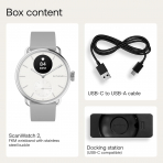 ScanWatch 2, paslanmaz çelik tokalı FKM (floroelastomer) bileklik, yerleştirme istasyonu (USB-C uyumlu), USB-C - USB-A kablosu dahil, Hızlı Başlangıç ​​Kılavuzu, Ürün Kılavuzu paket içerisinde bulunur.