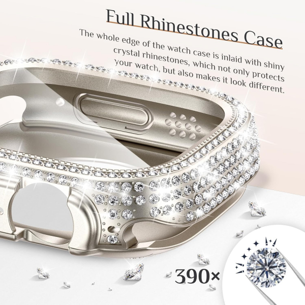 Bu kılıf, saatinize ışıltı ve ihtişam katan ışıltılı yapay elmaslara sahiptir.