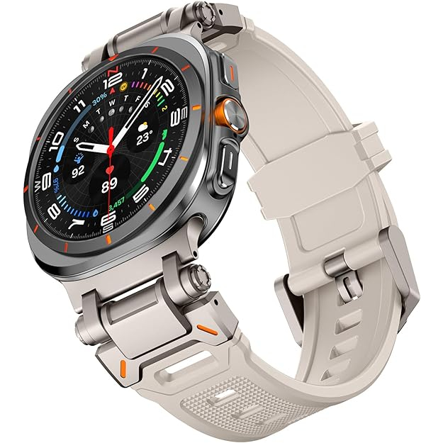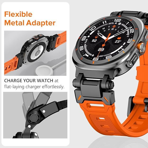 Turuncu vurgulara sahip renk uyumlu metal konektörler, Samsung Galaxy Watch Ultra 47mm'nin paslanmaz çeliğiyle mükemmel bir şekilde eşleşerek dayanıklı ve şık bir görünüm sunar.
