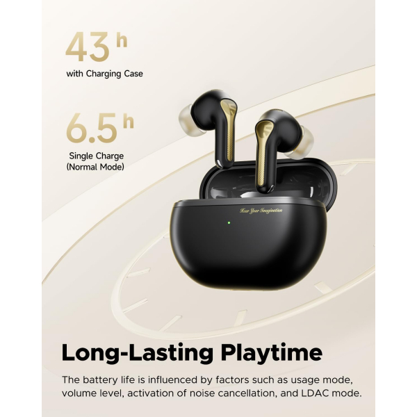 Capsule3 Pro+ LDAC kulaklıklar, tek bir şarjla 6,5 ​​saate kadar kesintisiz oynatma süresi sağlar ve şarj kutusu ile 43 saate kadar uzar.