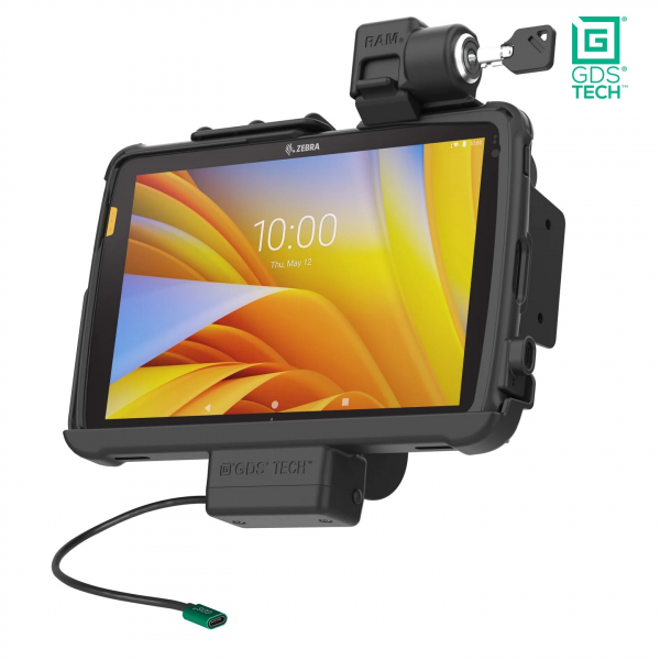 Şarj yetenekleri için GDS® Teknolojisi™ ve hırsızlığı önlemek için bir anahtar kilidi bulunan Zebra ET40 ve ET45 10" kurumsal tabletler için IntelliSkin® Yeni Nesil koruyucu kılıflı GDS® Araç Yuvası, cihaz yuvaya yerleştirildiğinde pogo pimi temas noktaları aracılığıyla cihazı şarjlı tutmanızı sağlar.