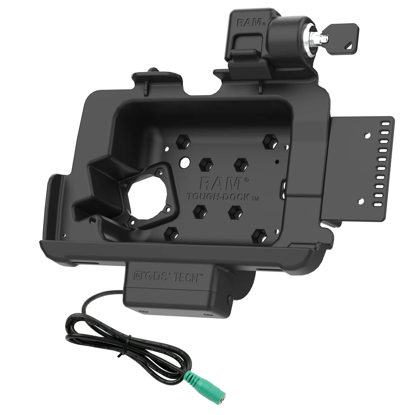 Şarj yetenekleri ve hırsızlığı önlemek için bir anahtar kilidi sunan Zebra ET40 ve ET45 8" kurumsal tabletler için Sağlam Çerçeveli RAM® Tough-Dock™, cihaz yerleştirildiğinde pogo pimi temas noktaları aracılığıyla cihazı şarjlı tutmanızı sağlar.