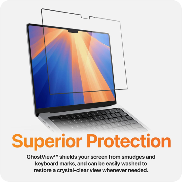 Manyetik olmayan Air-Ttach teknolojisi sayesinde GhostView ekranınıza yapışır ve MacBook'unuzu kapatırken yolunuza çıkmaz.