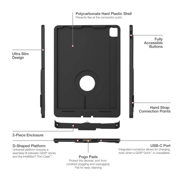 Apple iPad Pro 12.9 (3. - 6. Nesil) için IntelliSkin Thin-Case (RAM-GDS-SKIN-AP37-TCD), GDS® Uni-Conn yerleştirme platformu için tasarlanmış, alçak profilli, iki parçalı bir cihaz muhafazasıdır.