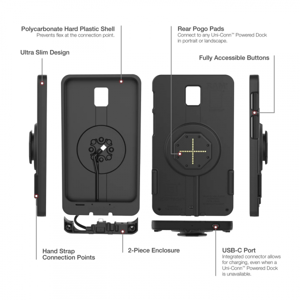 Tab Active5 ve 3 için Arka Pogo Pedli IntelliSkin Thin-Case (RAM-GDS-SKIN-SAM93-TCB), GDS Uni-Conn yerleştirme platformu için tasarlanmış, alçak profilli, iki parçalı bir cihaz muhafazasıdır.
