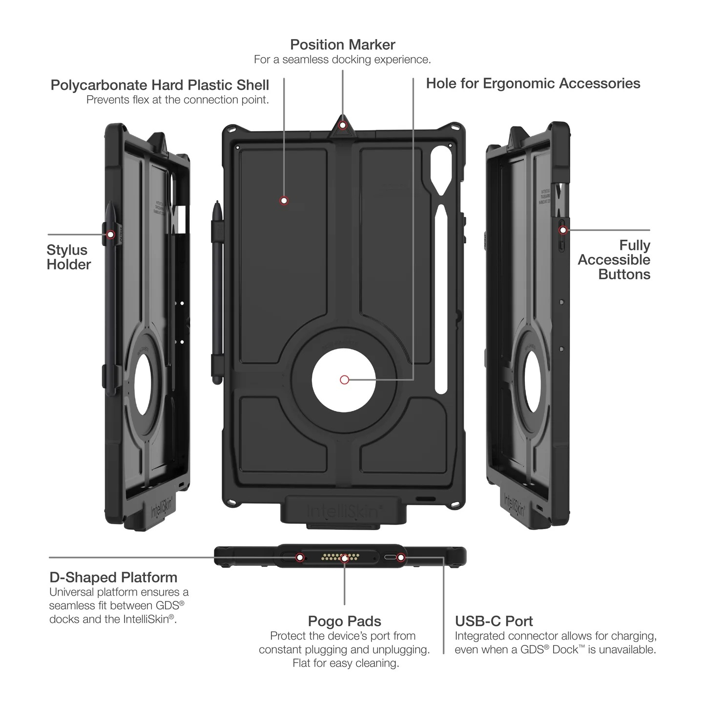 Samsung Galaxy Tab S9+ ve S9 FE+ için IntelliSkin Yeni Nesil, çeşitli GDS Dock ve aksesuarların yanı sıra mevcut GDS araç yuvalarını yükseltmek için yeni yerleştirme kaplarıyla uyumludur.