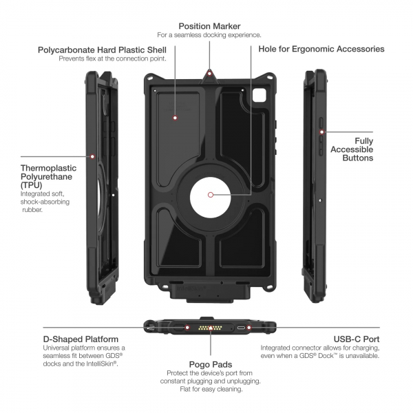 Samsung Galaxy Tab A7 10.4 (SM-T500) için IntelliSkin Yeni Nesil, çeşitli GDS Dock ve aksesuarlarıyla ve mevcut GDS araç yuvalarını yükseltmek için yeni yuva kaplarıyla uyumludur.