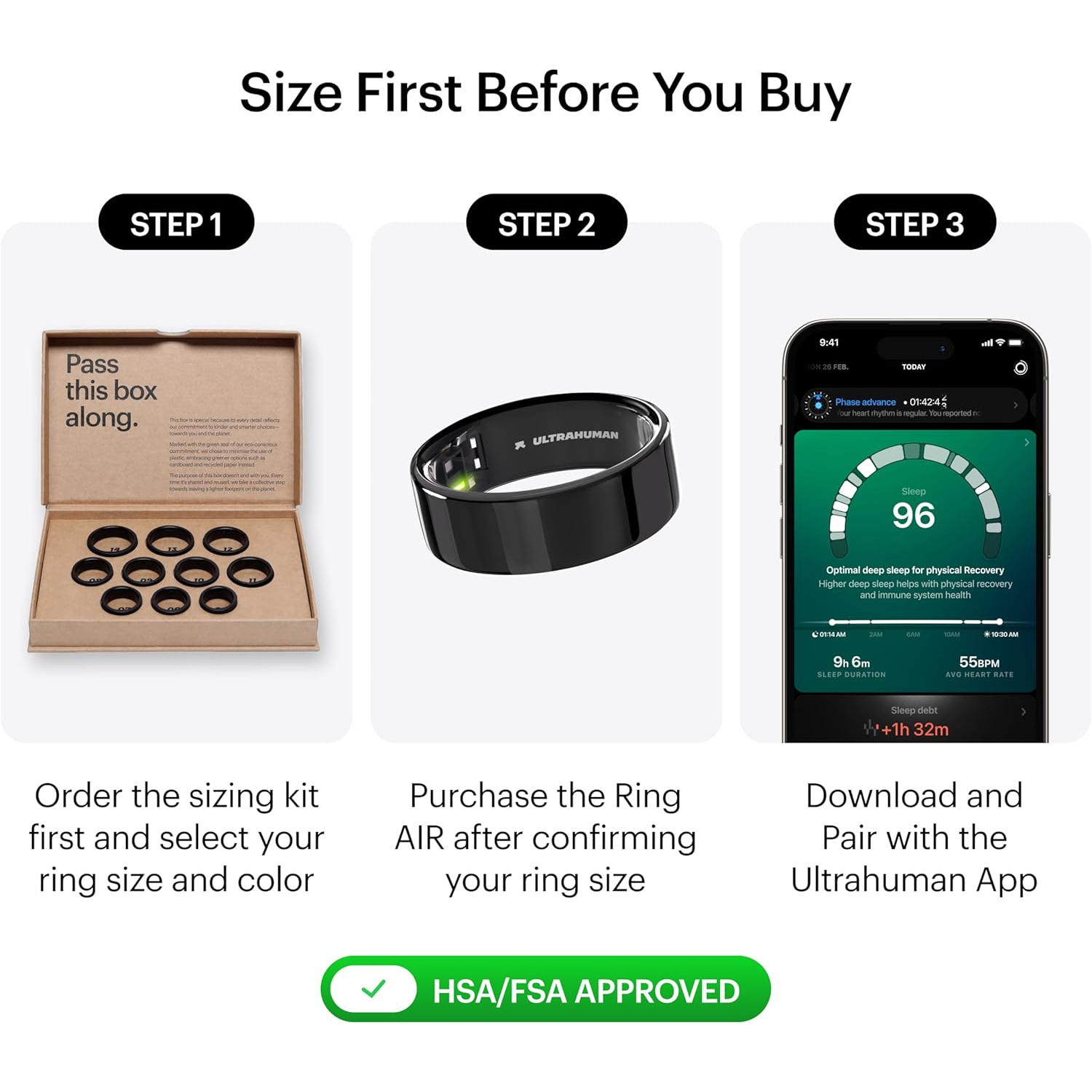 Pürüzsüz bir iç kabuğa sahip olan ve savaş uçağı sınıfı titanyumdan üretilen Ultrahuman Ring AIR, 6 günlük pil ömrüne, kablosuz şarja ve 100 metreye kadar suya dayanıklılığa sahiptir.