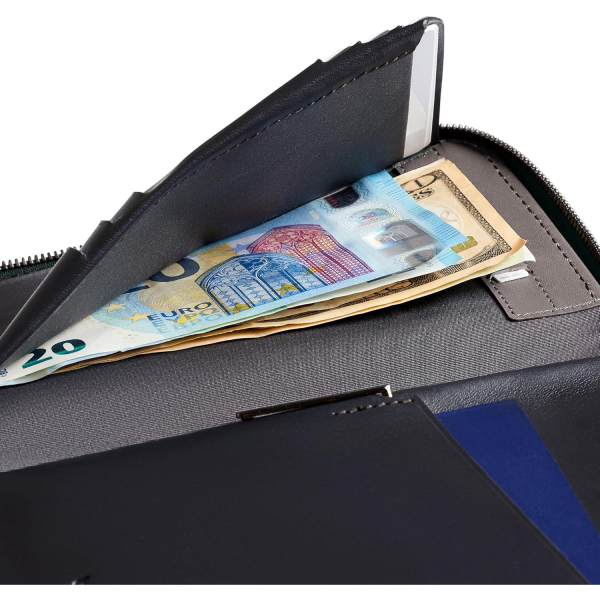 Sağda bir pasaport cebi ve altında ikinci bir pasaport, biniş kartları veya makbuzlar için gizli bir cep bulunur.
